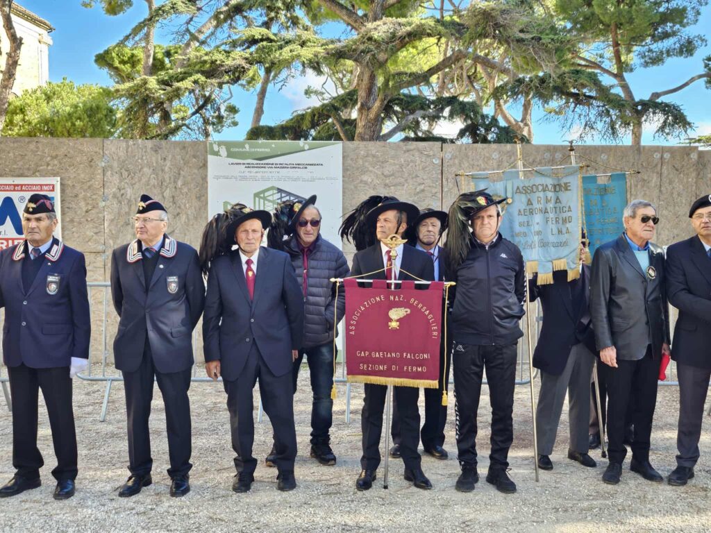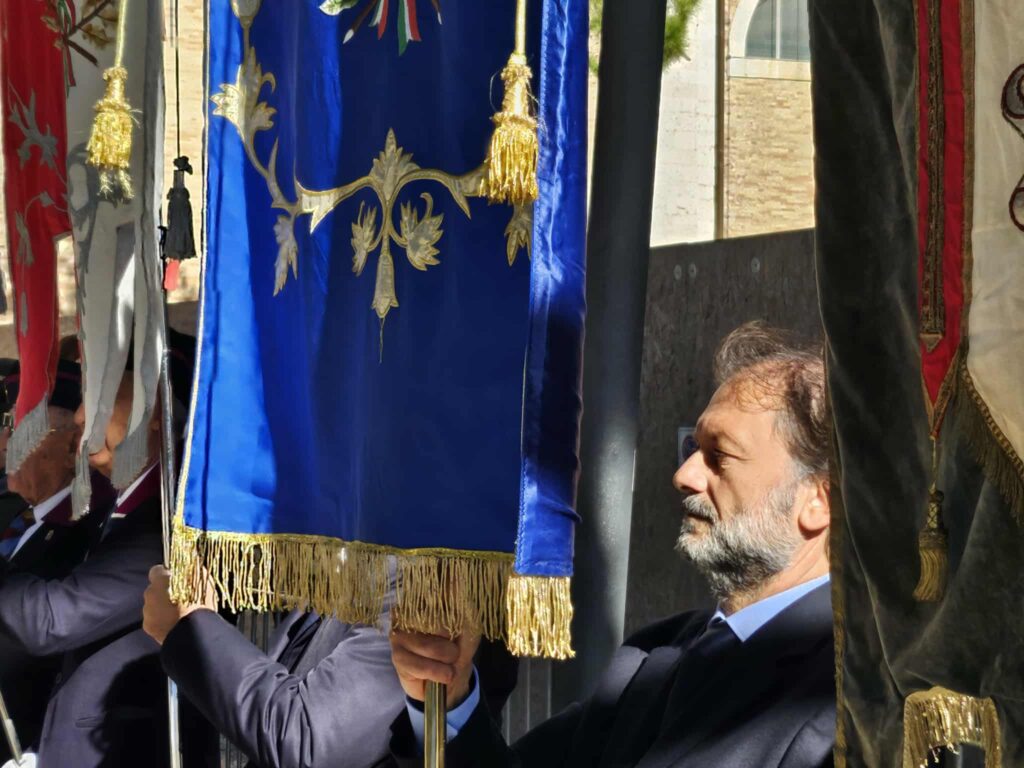 FERMO – Il piazzale del Girfalco si colora di gonfaloni e divise, da quelle delle forze dell’ordine a quelle armate per arrivare alle varie associazioni. E poi fasce tricolori, spicca quella di Paolo Calcinaro in versione sindaco e non assessore, affiancato da altri sei primi cittadini, a quella blu di Michele Ortenzi.
