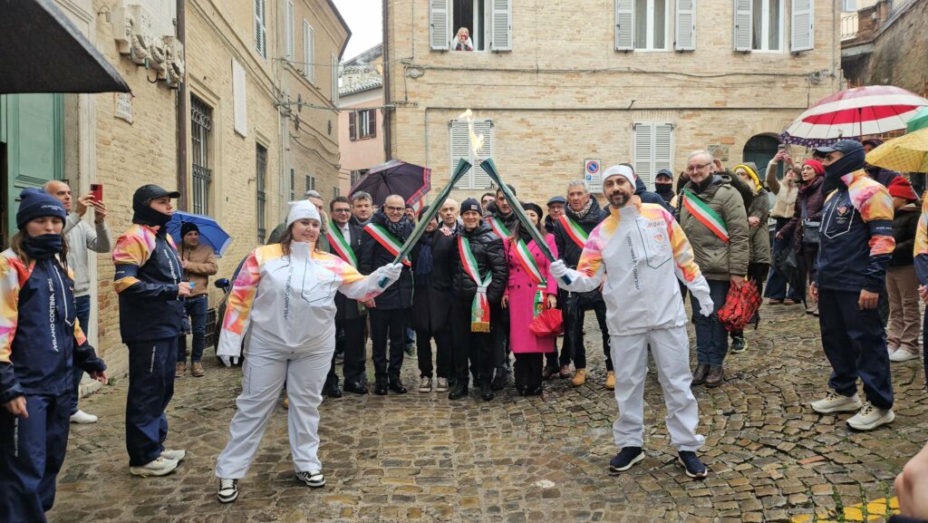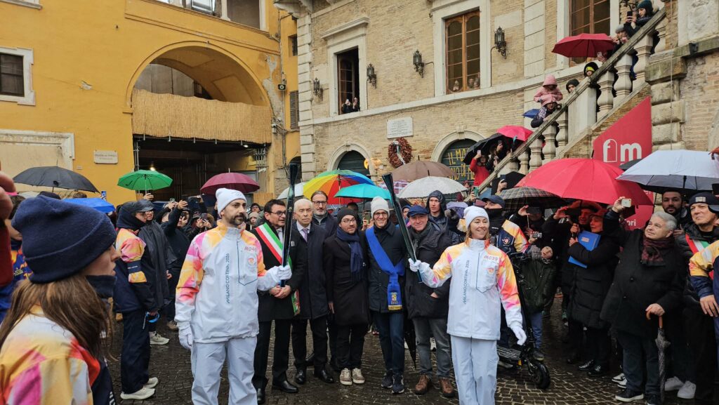 FERMO – Fiamma bagnata, Olimpiade fortunata. Questo il messaggio che manda Fermo alle Olimpiadi invernali di Milano – Cortina. Non manca il pubblico, tanti i fermani festanti che hanno accompagnato i tedofori con gli applausi.