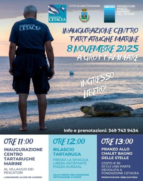GROTTAMMARE - Nasce a Grottammare il primo Centro per Tartarughe marine della provincia di Ascoli Piceno. Il presidio sarà ospitato all'interno del Villaggio dei Pescatori e verrà inaugurato sabato 8 novembre, alle ore 11. La decisione nasce dall'intesa tra il Comune di Grottammare e la Fondazione Cetacea onlus di Riccione, associazione con deroga ministeriale per il recupero e la cura delle tartarughe marine nella regione Marche. Per celebrare l'occasione, in collaborazione con i promotori del Parco Marino del Piceno, si terrà anche il rilascio di una tartaruga marina: Peace, questo il nome dell'esemplare curato nella sede del Centro di Recupero Cura e Riabilitazione delle tartarughe marine gestito dalla Fondazione Cetacea, tornerà a nuotare libera dalla spiaggia antistante piazza Kursaal, alle ore 12 (condizioni meteo-marine permettendo). Il nuovo Centro rappresenterà un presidio strategico per la salvaguardia della specie nel sud delle Marche — l'altro si trova nel Pesarese — poiché consentirà interventi più rapidi ed efficaci nel recupero degli animali in difficoltà. Sarà anche un punto di informazione e sensibilizzazione dedicato alla tutela del mare Adriatico, rafforzando i progetti di educazione ambientale e valorizzazione del patrimonio naturale che fanno di Grottammare una città attenta alla sostenibilità, alla biodiversità e alla cura del mare. La mattinata si concluderà con un pranzo conviviale allo Chalet Bagno delle Stelle, finalizzato alla raccolta di fondi da destinare alla Fondazione Cetacea onlus.