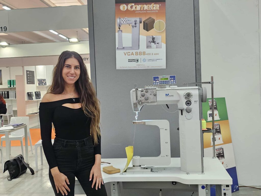 Attorno a lei, ci sono macchine da cucine che si proiettano verso il cielo, completamente differenti da quelle che uno è abituato a vedere in azione: “Il primo modello a colonna l’ha inventato mio nonno. Da lì, no ci siamo più fermati. È un sistema che perette una precisione maggiore e garantisce performance senza pari”. Ed è per questo che Cometa entra dentro le aziende dell’automotive, “nuova fetta importante di business a cui abbiamo dedicato anche una macchina nuova a due aghi”, e della pelletteria di precisione.
