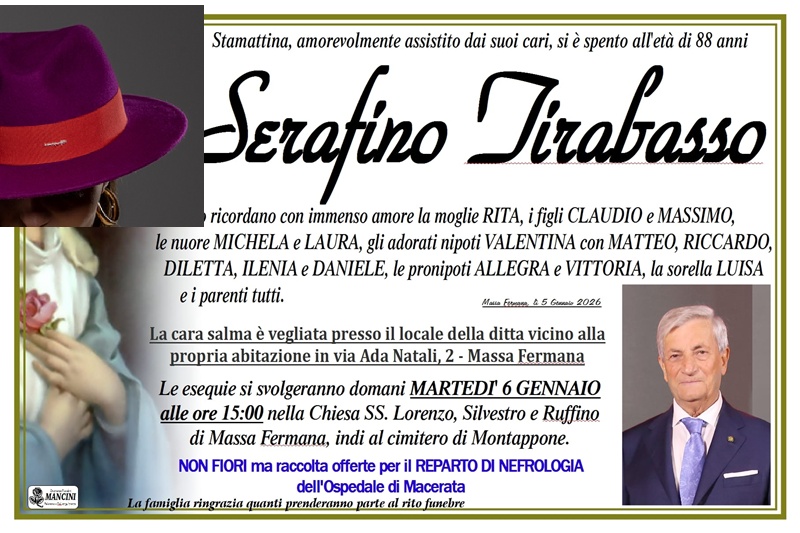 Parole che tornano anche in Paolo Marzialetti, presindete della sezione cappelli di Tessilvari: “La perdita di Serafino Tirabasso, nostro storico presidente del Consorzio Cappeldoc Mrche per la promozione e valorizzazione del cappello marchigiano, rappresenta un passaggio molto doloroso. Serafino fa parte di quella ristretta schiera di imprenditori che negli anni '60 fonda la sua azienda partendo dal nulla e portandola a essere da qualche decennio, assieme ai figli Claudio e Massimo, la più rilevante del nostro distretto. Il suo esempio e la sua forza di volontà, pensiamo soltanto a come ha affrontato anche la sua malattia, resteranno per sempre un faro da seguire, non solo per la sua Famiglia, ma anche per tutti noi imprenditori del distretto del cappello”.