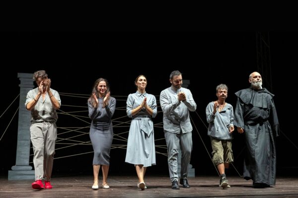 In scena il nucleo storico di Proscenio, Stefano De Bernardin, Lorenzo Marziali e Stefano Tosoni, affiancati da Venusia Zampaloni, Simona De Leo e Kevin Pizzi.