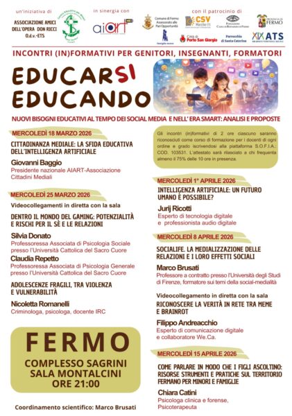 FERMO - Al via dal 18 marzo al 15 aprile 2026 il ciclo di incontri dal titolo “Educarsi educando. Nuovi bisogni educativi al tempo dei social media e nell’era smart: analisi e proposte”. La nuova e qualificata edizione di incontri (in)formativi è un’iniziativa dell’Associazione Amici dell’Opera don Ricci e del Centro Educativo per Minori don Ricci, in sinergia con Aiart, con il patrocinio del Comune di Fermo – Assessorato alle Pari Opportunità, Csv Marche, Famiglia Nuova, Città di Porto San Giorgio, Fondazione Cassa di Risparmio di Fermo, Provincia di Fermo, Parrocchia Santa Caterina, Ambito Sociale XIX.