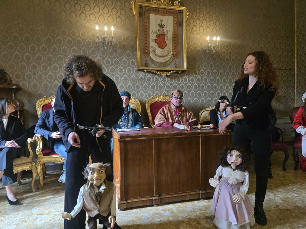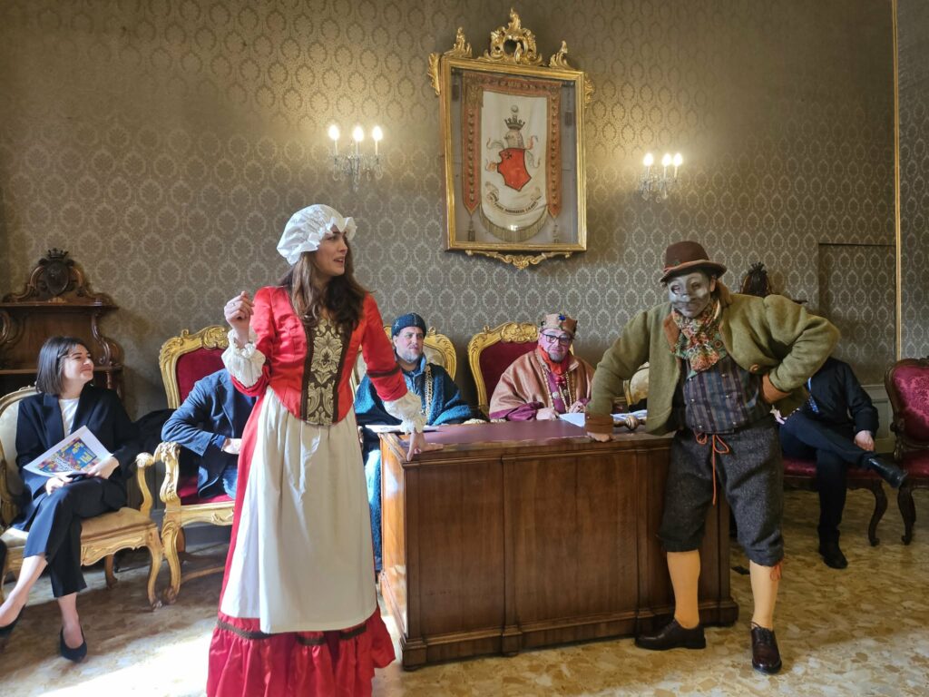 A rendere unico nel suo genere Baraonda è anche la capacità di unire scuole, associazioni, gruppi privati, contrade e parrocchie. “Ognuno lavora a suo modo, con le contrade che organizzano veglioni e con le scuole che rendono la sfilata un vero unicum” ribadisce l’assessora. Che mentre parla viene interrotta dalle due maschere delle città: Mengone Torcicolli (Mirco Abbruzzetti), con l’amata Lisetta (Venusia Morena Zampaloni), e Lu Cucà (Simona Ripari).