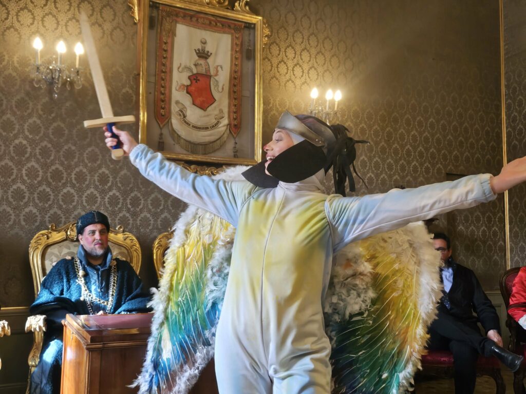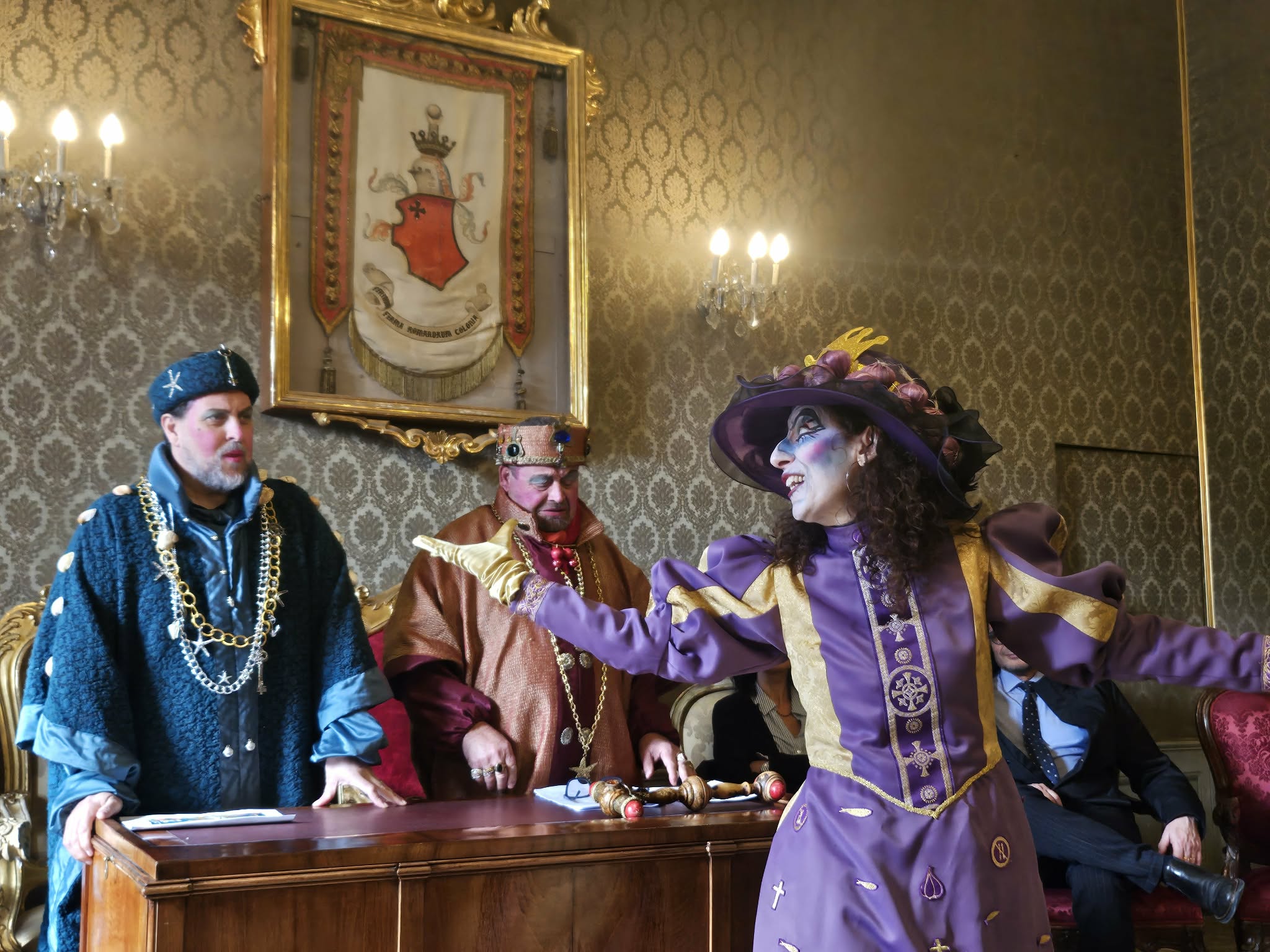 “E ora i sindaci abdicheranno” annuncia il re Valentino Eugeni affiancato dal collega di corona Luigi Palloni. “Le vostre città vi saranno ridate a tempo debito. Quando arriverà all’ultimo giorno la Quaresima (Beatrice Bellabarba). Prima, però, scapiglieremo il mondo e lo rovesceremo, sperano così di riassettarlo”.