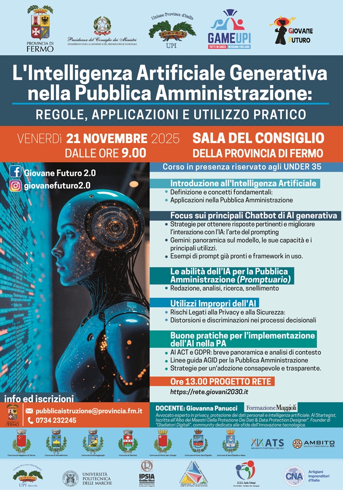 FERMO – Come può l’intelligenza artificiale aiutare la pubblica amministrazione? Una risposta arriverà il 21 novembre nella sala consiliare della Provincia di Fermo.