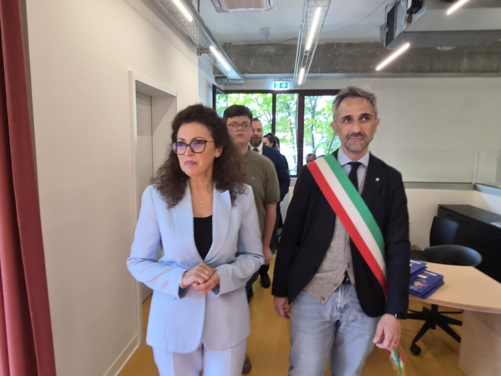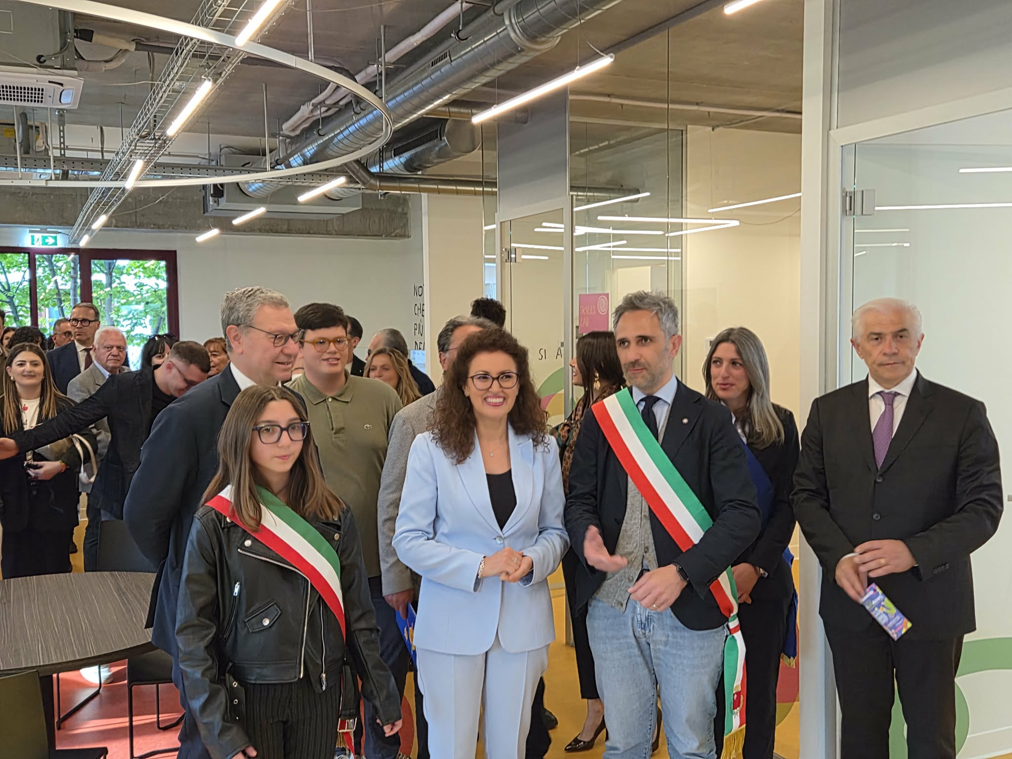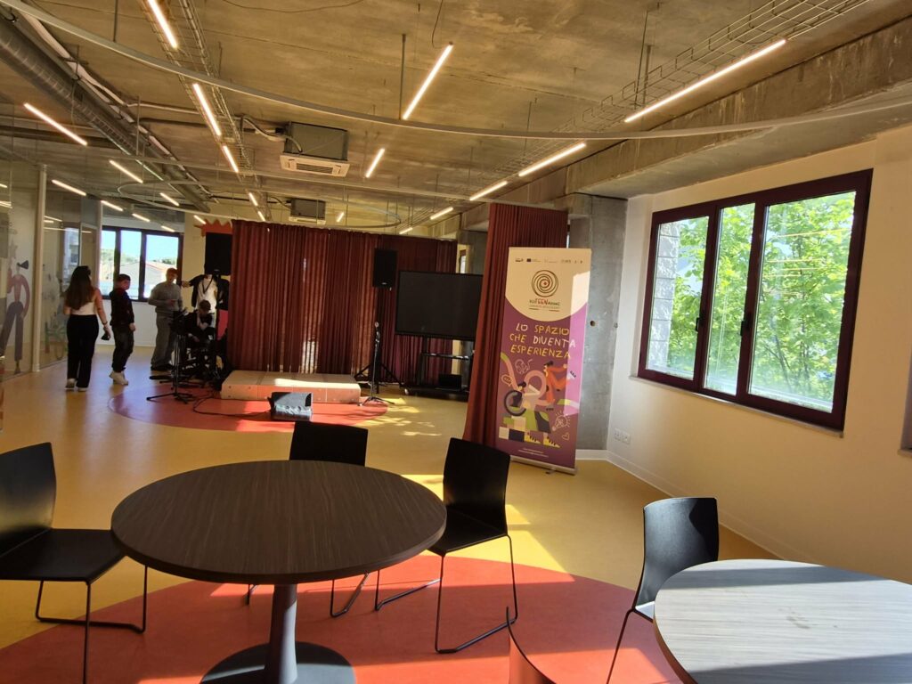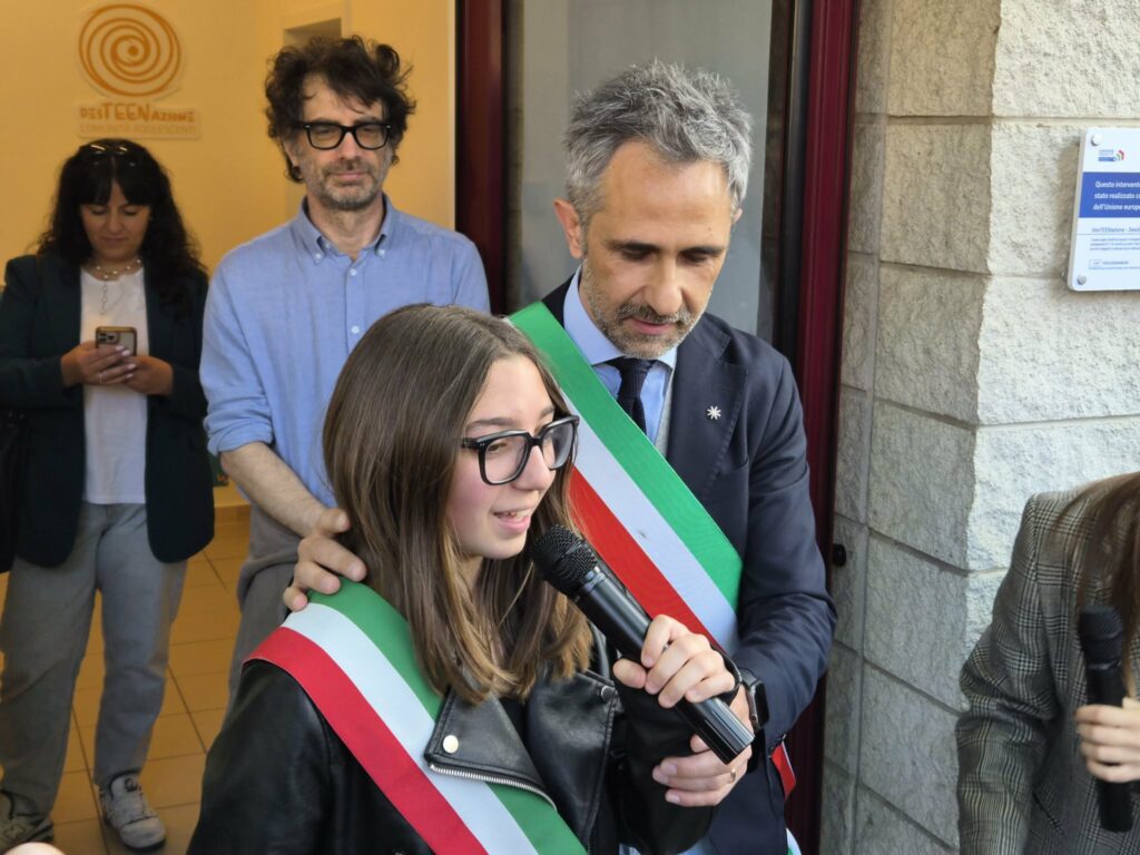 Lo stupore della viceministra è reale, perché davanti a sé ha un openspace su cui si affacciano tre stanze a vetrata con all’interno una sala podcast, un’area giochi e uno spazio multifunzione. Al centro della grande sala, poi, oltre ai tavoli per potersi ritrovare, c’è anche un palchetto: “Perché qui anche la musica sarà un mezzo di vera espressione e condivisione” aggiunge Bellucci che incassa il grazie di Agnese Panfili, la sindaca del consiglio comunale dei ragazzi e delle ragazze.