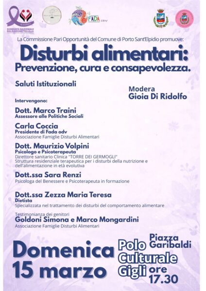 PORTO SANT'ELPIDIO - In occasione della Giornata Nazionale del Fiocchetto Lilla, dedicata alla lotta contro i disturbi del comportamento alimentare (DCA), la Commissione pari opportunità del Comune di Porto Sant’Elpidio organizza l'evento pubblico dal titolo: "Disturbi alimentari: prevenzione, cura e consapevolezza". L’appuntamento è fissato per domenica 15 marzo alle ore 17:30 al Polo culturale Gigli in piazza Garibaldi. L'obiettivo dell'incontro è sensibilizzare la cittadinanza su patologie sempre più diffuse, fornendo strumenti di comprensione e illustrando i percorsi di cura disponibili sul territorio. Interverranno la presidente dell’associazione Fada Odv (Famiglie disturbi alimentari) Carla Coccia, del direttore sanitario della clinica Torre dei germogli, Maurizio Volpini, della psicoterapeuta Sara Renzi e della dietista Maria Teresa Zezza. Oltre all’approccio clinico e istituzionale, sarà dato spazio a chi vive queste realtà quotidianamente. È prevista infatti la testimonianza dei genitori Simona Goldoni e Marco Mongardini, dell’associazione Fada, per condividere l’importanza della rete di supporto familiare nel percorso di guarigione. “Ringrazio e la vicepresidente della Commissione pari opportunità Rachele Fiorini e la consigliera Gioia Di Ridolfo che modererà l’iniziativa – sottolinea l’assessore alle pari opportunità, Elisa Torresi – la loro sensibilità ed attenzione al tema è stata fondamentale per organizzare questo pomeriggio, insieme alle associazioni che operano nel settore. Sarà un importante momento di riflessione e approfondimento, insieme a ospiti autorevoli e testimoni che vivono quotidianamente la difficoltà di combattere un disturbo complesso, che riguarda molti giovanissimi.”. “Conoscere i disturbi del comportamento alimentare è fondamentale, saper cogliere i segnali per affrontare tempestivamente il problema fa la differenza – aggiunge la presidente della Commissione pari opportunità, Laura Iannone – Ecco perché iniziative come quella di domenica prossima sono preziose per tutti: famiglie, ragazzi, educatori”.