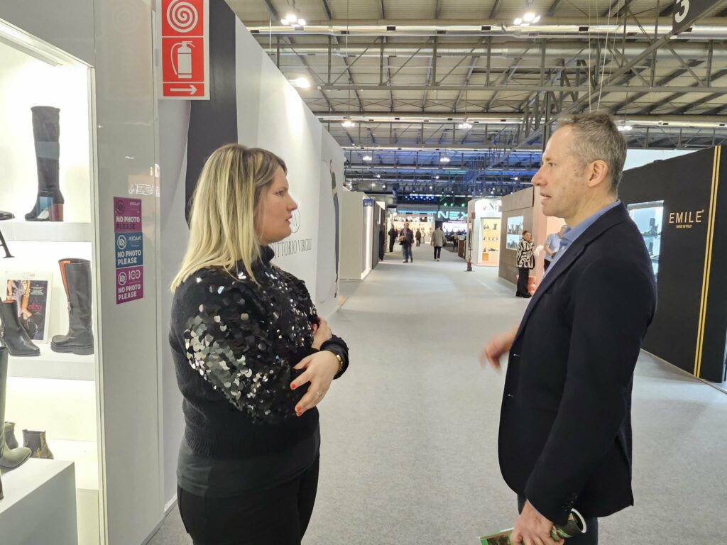 La nuova collezione è ricca, il pezzo da non perdere è quello in cavallino. “E’ la pelle del 2026, un materiale pregiato che però piace al mercato. L’importante è lavorarlo al meglio e su questo i nostri artigiani sono impeccabili” conclude la titolare prima di fermarsi a parlare con Paolo Borghini, il direttore del Micam che è sempre in cerca di spunti per migliorare.