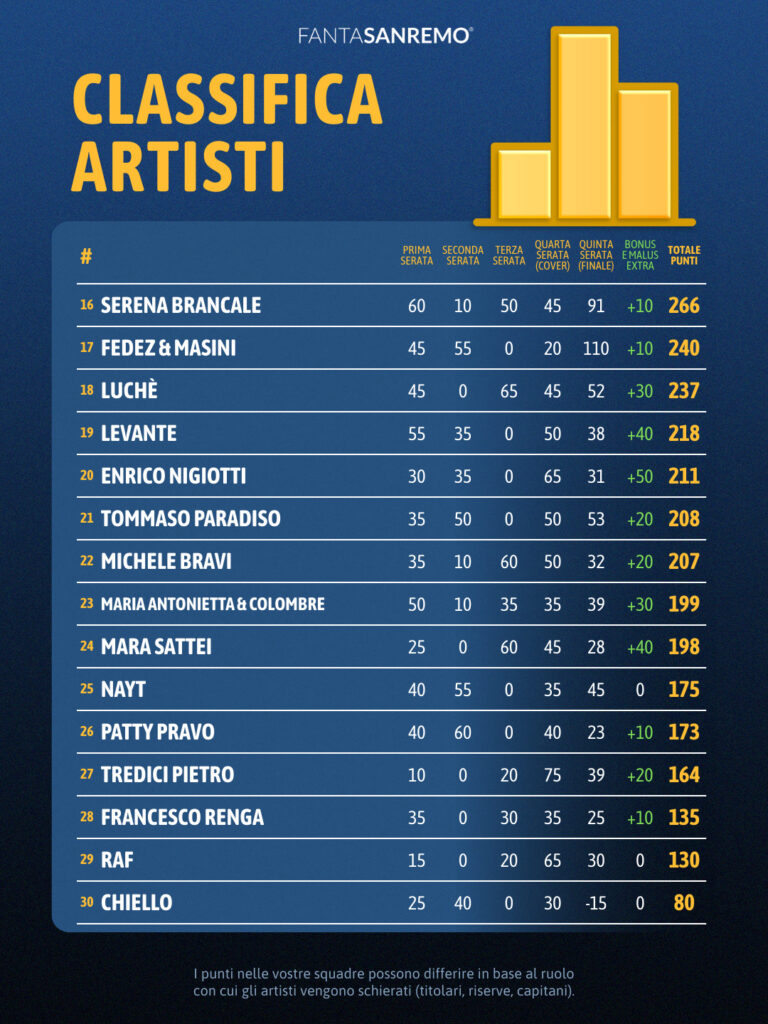 Tornando alla classifica, la top ten si completa con Samurai Jay con 512 punti, Dargen D'Amico con 484, Ditonellapiaga con 460, Elettra Lamborghini con 427, Eddie Brock con 420, J-Ax con 411 e Sayf con 405.
