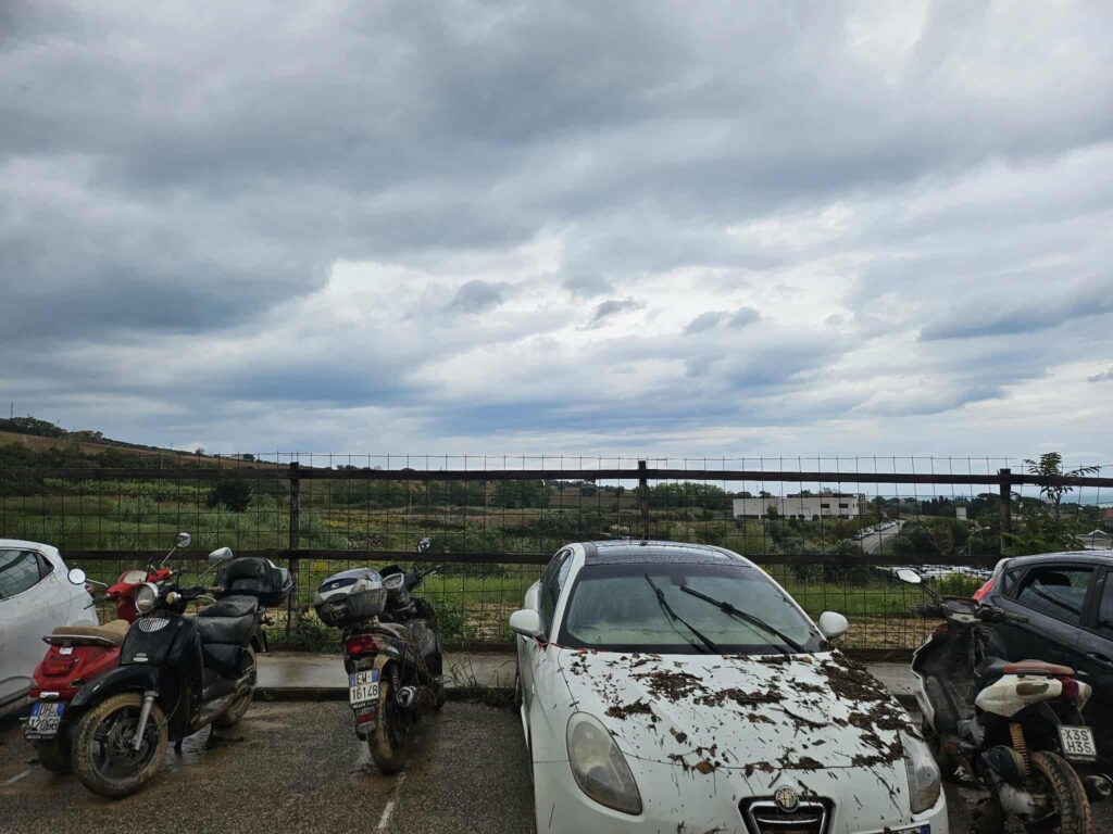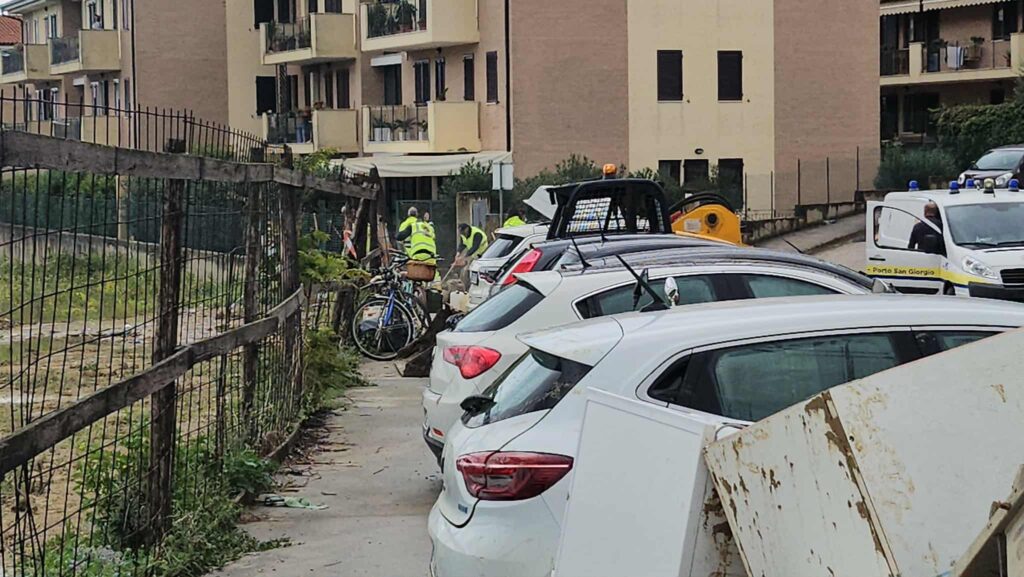 PORTO SAN GIORGIO – Fango lungo la strada, fango sulle auto, fango che copre gli scooter, fango che viene risucchiato dalle pompe dai garage di una palazzina di via Medi. Una decina di famiglie coinvolte, dodici mezzi danneggiati e soprattutto frigoriferi, lavatrici e tanti altri elettrodomestici pieni di terra e quindi pronti per diventare rifiuti speciali.