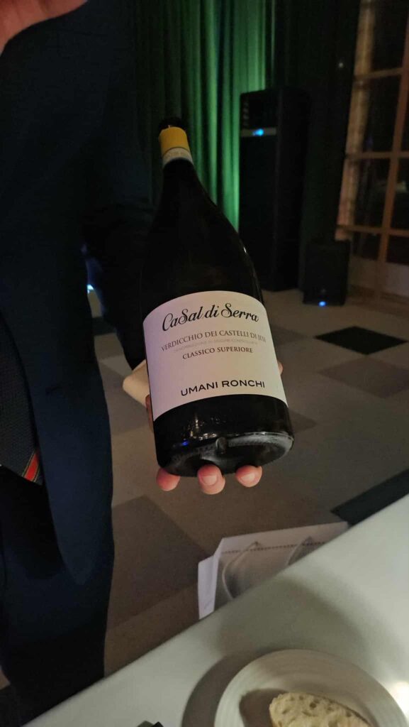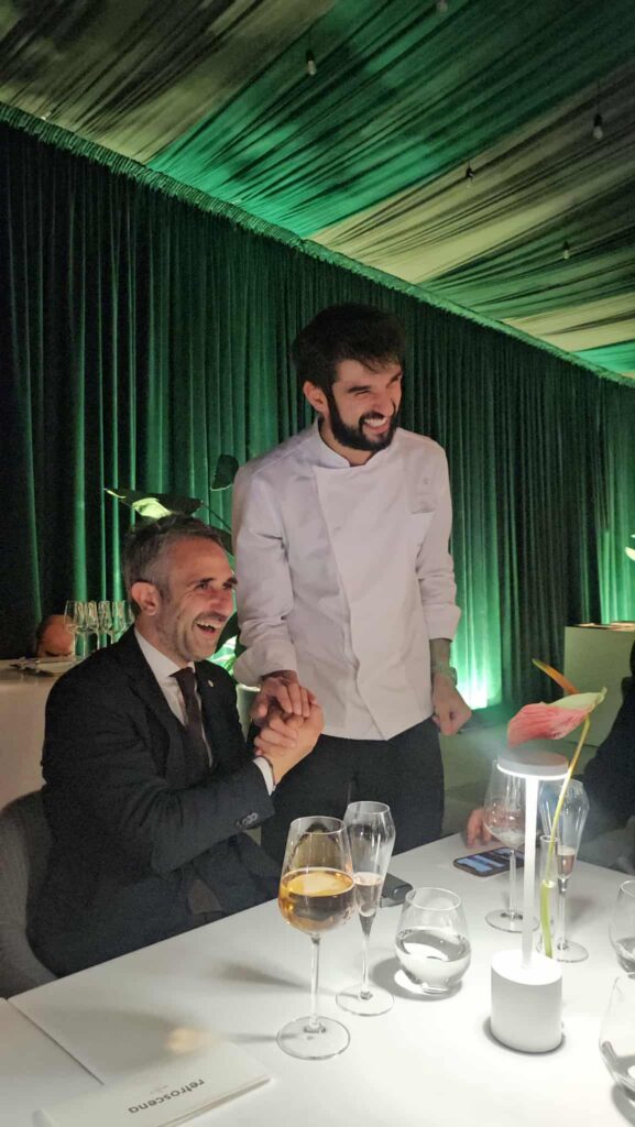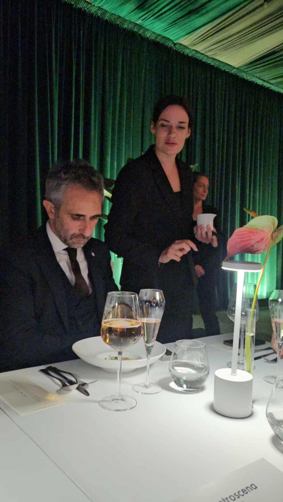 Mentre in tavola i bicchieri non restano mai vuoi, passando alla bollicina di Terrapremiata, la cantina di Graziano Mazza fondatore del brand di scarpe Premiata, da sempre al fianco di Richard per cui ha creato anche una esclusiva linea di abbigliamento, al Verdicchio prima di Jesi e poi di Matelica, la cena sinuosamente arriva alla fine, alla piccola pasticceria che riproduce in un bon bon un tiramisù e uno strudel.