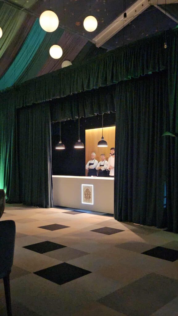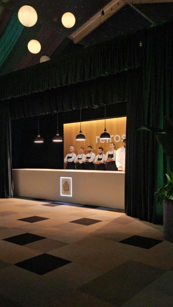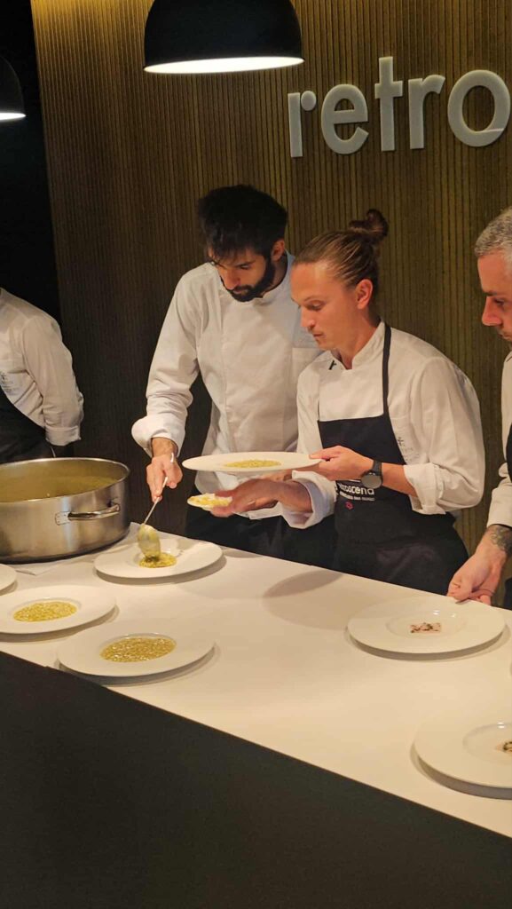 Tutti seduti, fino a quando non si apre il grande sipario, perché quello che vivranno gli ultimi ospiti di questa incredibile operazione che ha replicato un ristorante stellato in tutto e per tuto a migliaia di chilometri di distanza. È il momento di Richard Abou Zaki e della sua brigata, tutta schierata dietro il grande bancone che diventa il luogo da ammirare e fotografare, dove si impiatta ogni portata.
