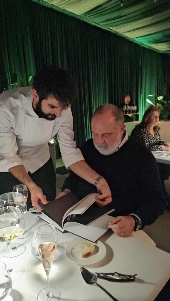 E poi c’è ‘l’ombrina de lu portu’ come scherza lo chef passando per il tavolo ‘italiano’ in cui spicca la presenza di Paolo Marchi, il giornalista ideatore e anima di Identità Golose con la moglie Luisa Acciarri, autore dell’introduzione del libro ‘Cooking my dream’ in uscita in Romania la prossima settimana, in Italia il 5 dicembre. Un testo in cui non racconto ricette, ma la