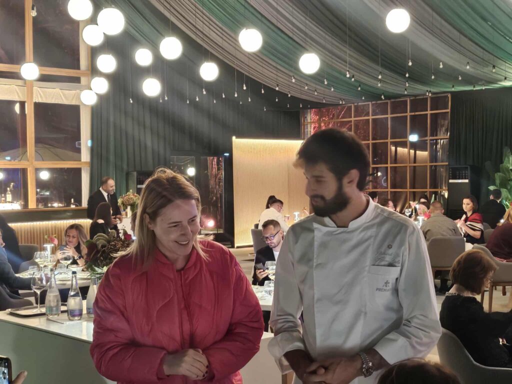 Un lungo discorso in rumeno accoglie gli ospiti, 65 coperti eleganti tra tavoli tondi e rettangolari per i mini gruppi. È qui che Abou Zaki inizia il racconto della ‘sua’ terra mentre parla a casa sua: le parole Marche e Porto San Giorgio sono scandite in maniera chiara, anche parlando i rumeno. E poi Porto San Giorgio, ricciola, ombrina, oliva ascolana e il suo cult: coccobello. La descrizione del dolce è semplice: “Vi sembrerà di essere su una spiaggia delle Marche, nella mia Porto San Giorgio”. Lo guarda e sorride il sindaco Valerio Vesprini, che dopo essere stato protagonista della diretta sulla tv nazionale incassa l’applauso della esclusiva clientela della cena.
