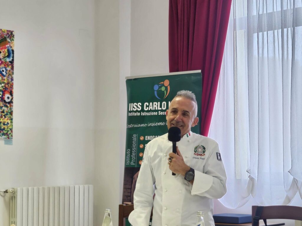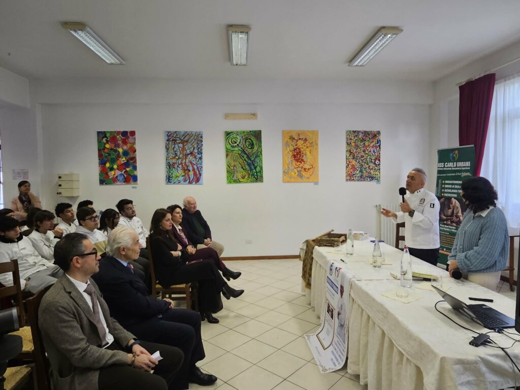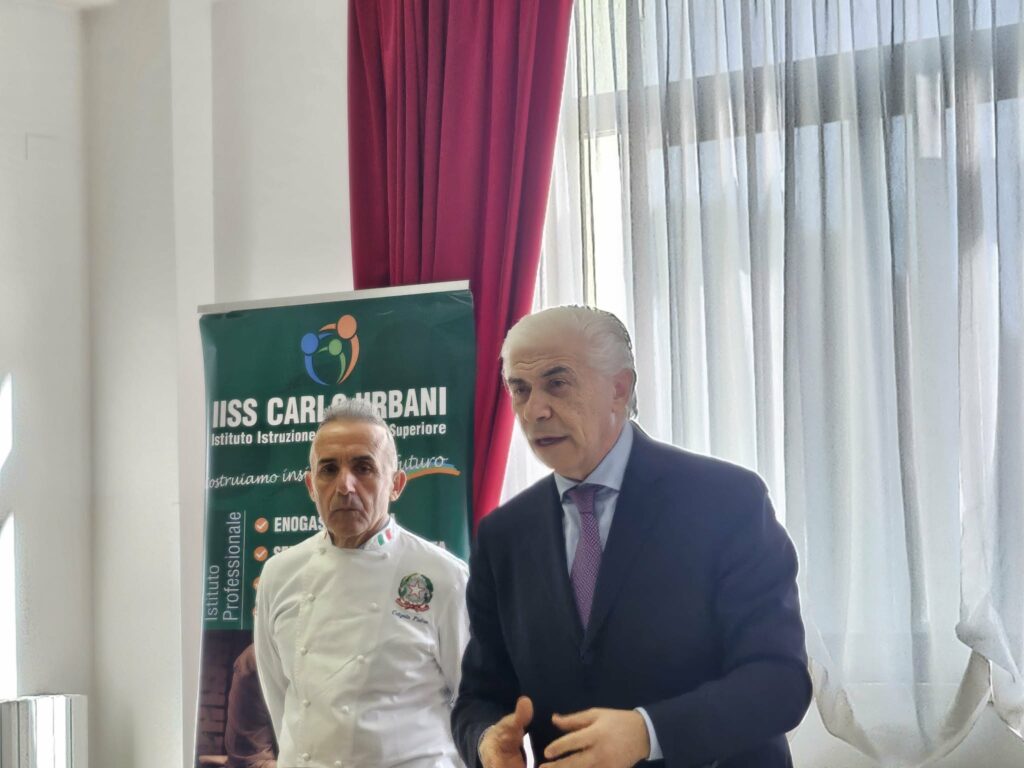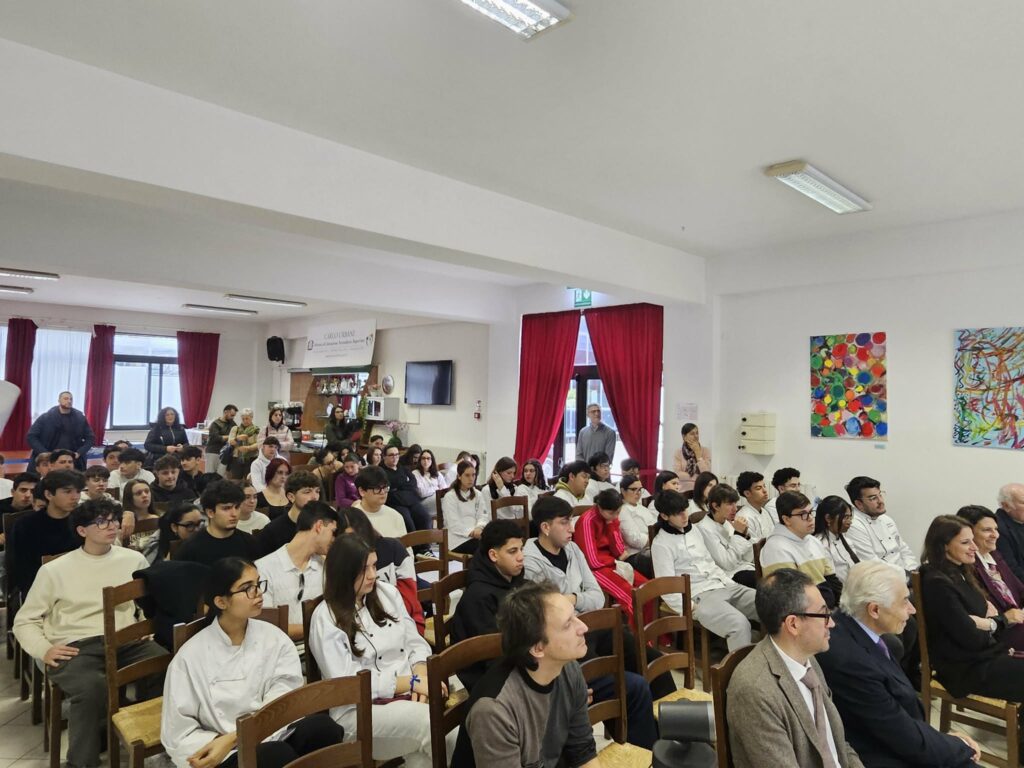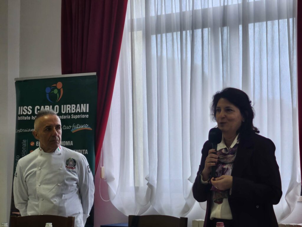 La dirigente Laura D’Ignazi ha ringraziato l’assessora Torresi e il sindaco per aver coinvolto gli studenti del Polo Urbani. “In sala abbiamo gli studenti del triennio e tanti collegati dalle aule. Oggi abbiamo qui il “cuoco”, come ama farsi chiamare, di cinque Presidenti della Repubblica. È la prova di come impegno, passione e talento possano portare all’eccellenza”.