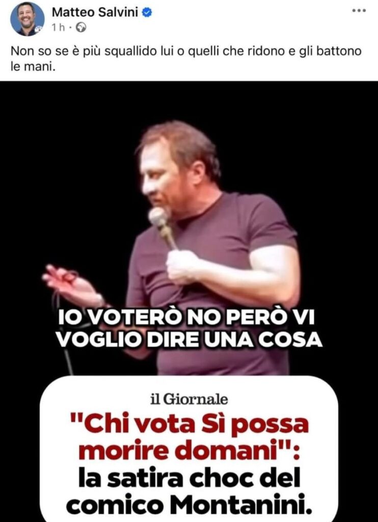 La frase, lanciata dal palco e rimbalzata (non a caso) sui social, è di quelle che fanno sobbalzare sulla sedia chi non conosce il genere: "Spero che chi vota Sì possa morire domani”. Apriti cielo. La destra, citando Andrea Scanzi, “è così torsola che sicuramente farà una polemica ebete sulla provocazione di Montanini su chi vota sì”.