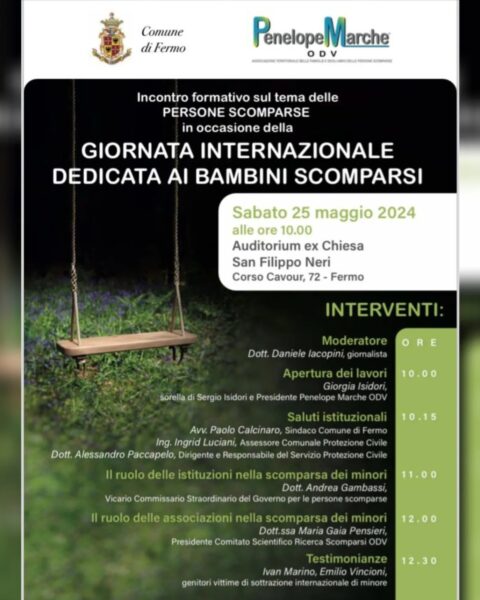 FERMO - In occasione della Giornata internazionale dei bambini scomparsi, l'Associazione Penelope Marche Odv e il Comune di Fermo organizzano un incontro formativo proprio sul tema delle persone che si allontanano dai contesti familiari, facendo perdere le proprie tracce.