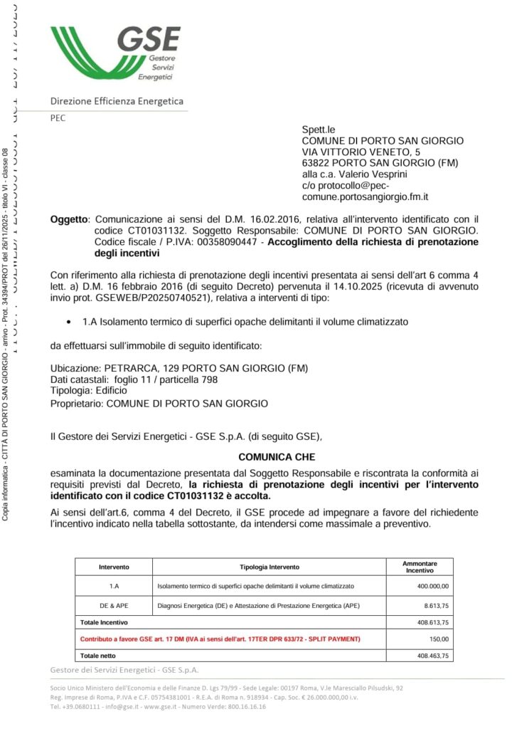 I fondi oggi riconosciuti rientrano nel Conto Termico 2.0, lo stesso canale di finanziamento già utilizzato per il Palazzetto dello Sport. “Per le restanti opere, l’Amministrazione è pronta a presentare la documentazione in vista dell’apertura della misura Conto Termico 3.0, prevista per il prossimo dicembre”.