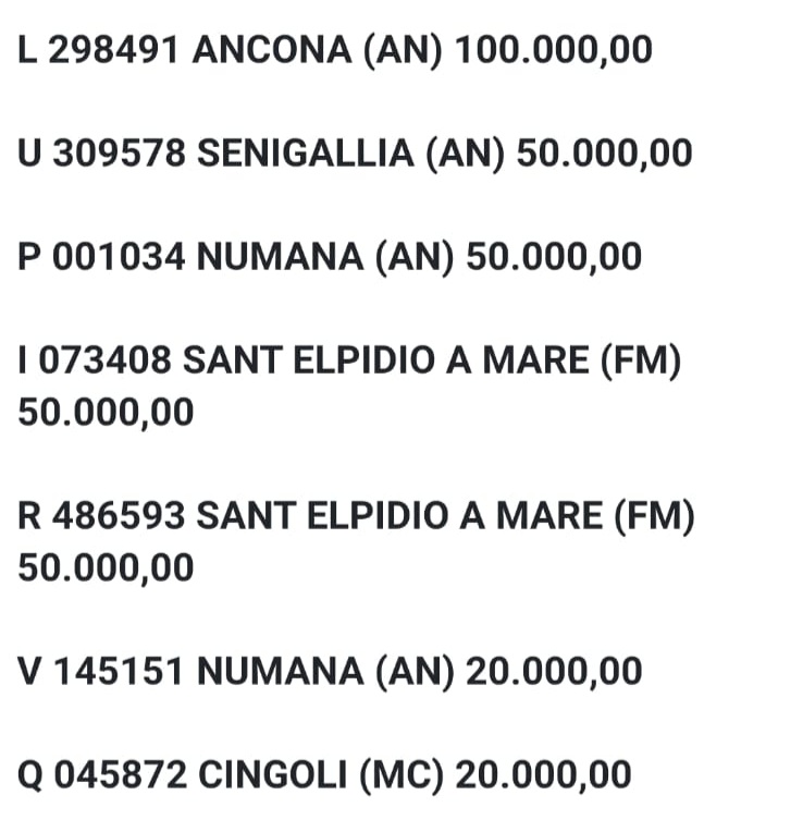 Due biglietti vincenti da 50mila euro anche a Sant'Elpidio a Mare (Fermo). Chiudono, infine, due premi di quarta categoria da 20mila euro ciascuno, vinti ancora a Numana e a Cingoli (Macerata).