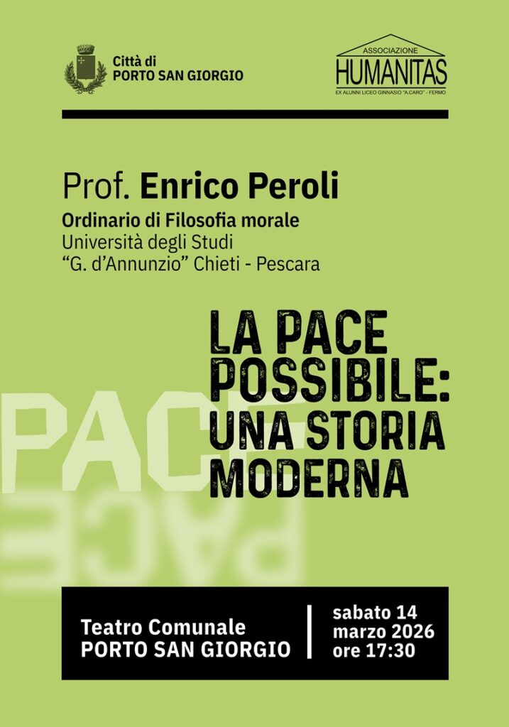 Domani alle 1730 al teatro di Porto San Giorgio, si potranno ascoltare le parole di Peroli tenute insieme dal titolo ‘La pace possibile: una storia moderna’.