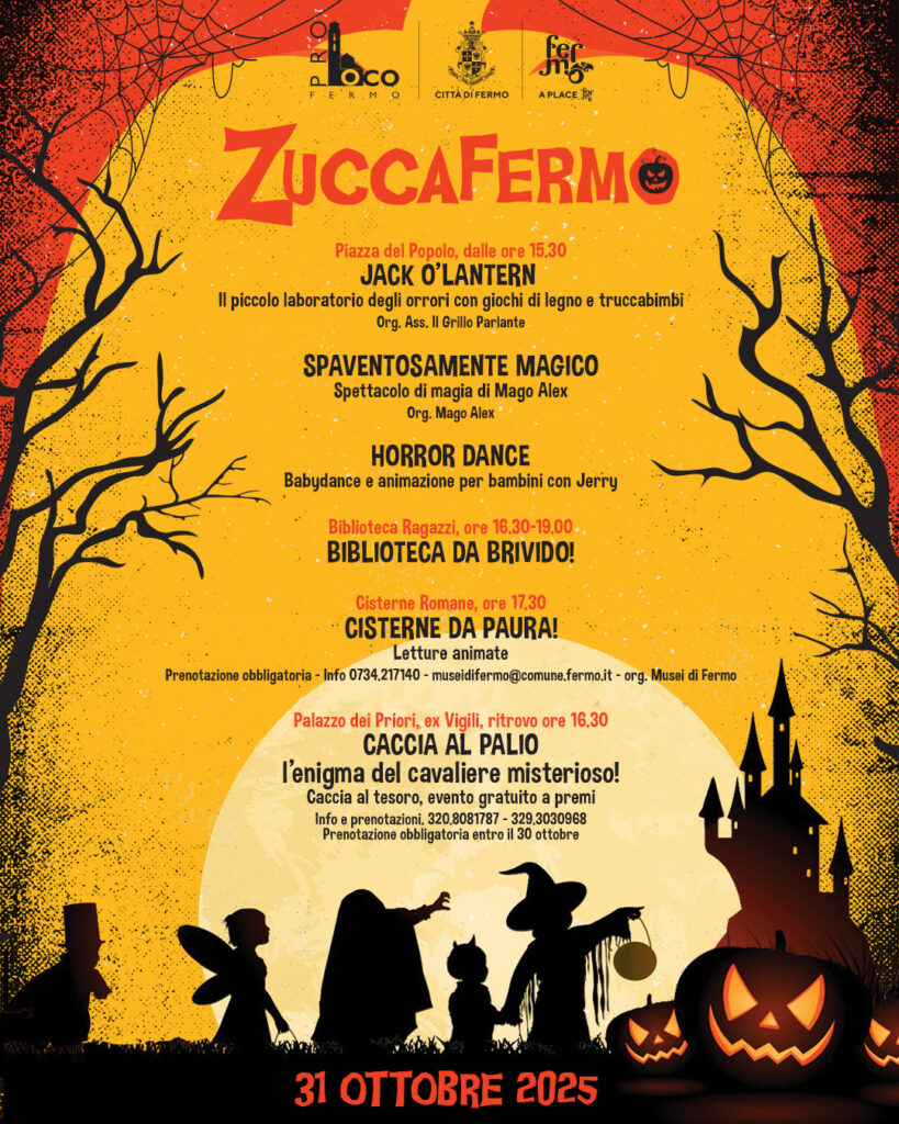 FERMO – Spettacoli, laboratori, letture animate, musica, caccia al tesoro. Un pomeriggio di festa in Piazza del Popolo il 31 ottobre a partire dalle ore 15.30 con tanti ingredienti per questa edizione 2025 di Halloween che vede un programma, chiamato “ZUCCAFERMO”, con l’organizzazione dell’Assessorato al Commercio e la collaborazione della Pro Loco e delle associazioni locali.