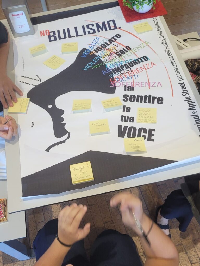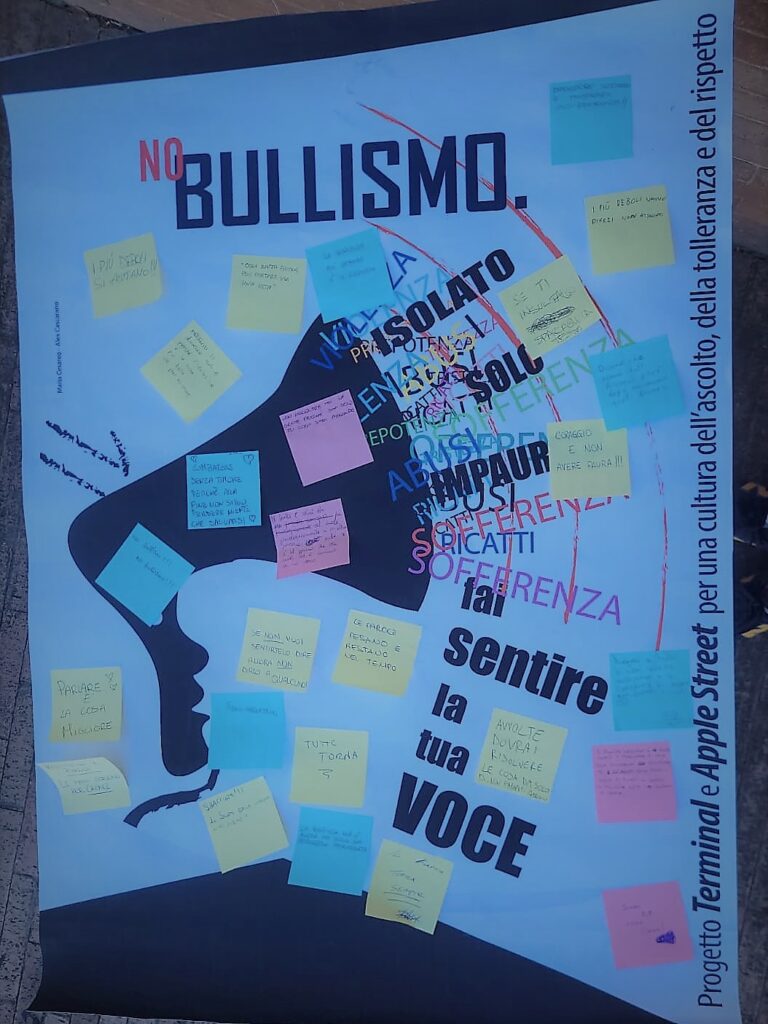 Durante gli incontri, i ragazzi hanno condiviso con gli educatori e tra loro esperienze personali o vissute da amici, legate a episodi di bullismo motivati da differenze fisiche, di genere, di orientamento sessuale, di origine etnica o da situazioni di disabilità. Al termine della riflessione, ciascuno studente ha ricevuto un foglietto adesivo e una penna: un gesto simbolico ma denso di significato. Su quei piccoli biglietti, i ragazzi hanno scritto un pensiero, un messaggio o un impegno personale contro il bullismo. Ifoglietti sono poi stati affissi liberamente sul materiale predisposto per l'occasione. Il collage finale di messaggi ha dato forma e forza all'impegno collettivo degli studenti diventando un vero manifesto di solidarietà, rispetto e consapevolezza. Tra le frasi emerse troviamo: "Restituisci a parole, le mani servono per creare." - "Parlare è la cosa migliore." - "Le parole pesano e restano nel tempo." - "I più deboli si aiutano!" - "Coraggio, non avere paura!"