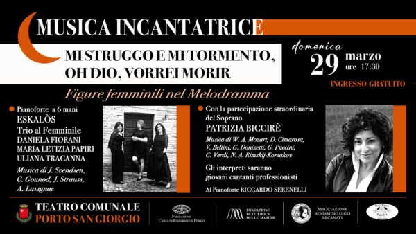 PORTO SAN GIORGIO - Domenica 29 marzo al teatro comunale si terrà il concerto della rassegna Musica incantatrice dal titolo "Mi struggo e mi tormento, oh Dio, vorrei morir" (ore 17,30).