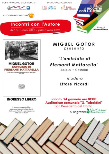 SAN BENEDETTO DEL TRONTO - Sabato 24 gennaio, alle ore 18, l'Auditorium comunale "G. Tebaldini" di San Benedetto del Tronto ospita un nuovo appuntamento della rassegna Incontri con l'Autore, giunta alla 44ª edizione. Protagonista dell'incontro sarà Miguel Gotor, che presenterà il libro "L'omicidio di Piersanti Mattarella. L'Italia nel mirino: Palermo, Ustica, Bologna (1979-1980)".