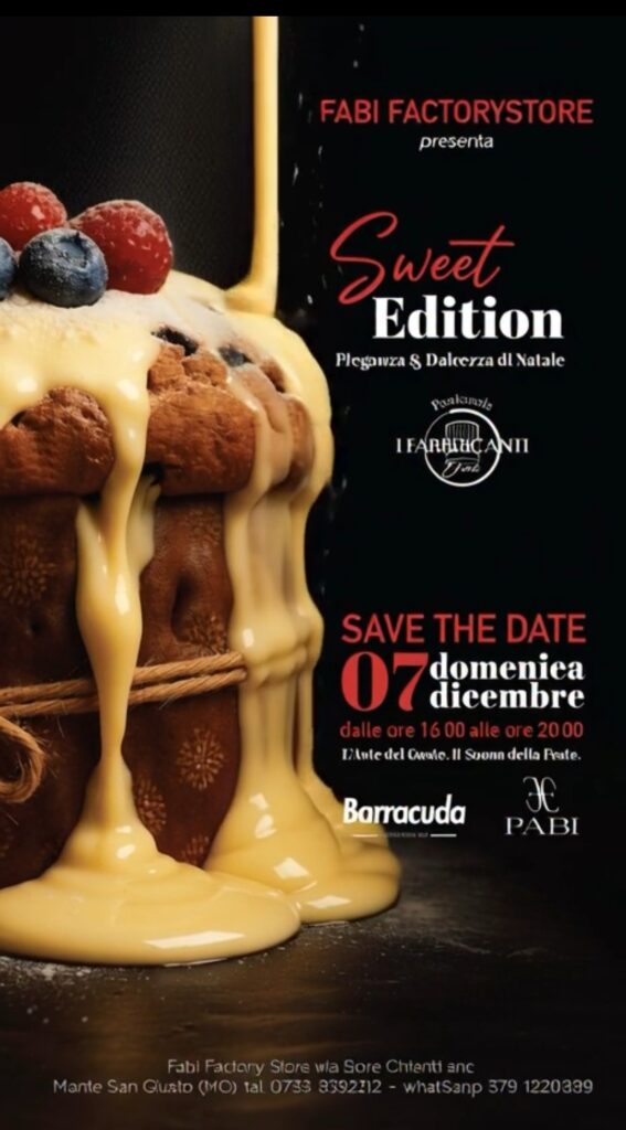 Appuntamento oggi dalle 16 alle 20 presso il Factory Store per un pomeriggio di vera festa in cui anche i dipendenti Fabi potranno godersi un attimo di dolcezza, mentre i clienti potranno muoversi tra un pezzo di panettone sempre potendo scegliere anche di acquistare un capo del total look Fabi.