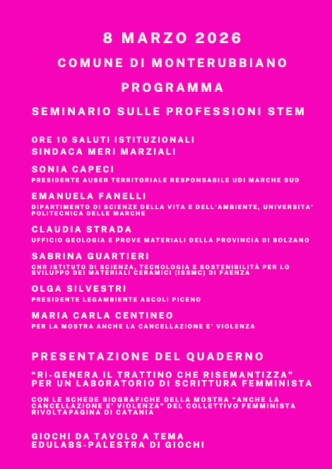 MONTERUBBIANO - Domenica 8 marzo 2026, in occasione della Giornata Internazionale della Donna, la Sala Consiliare di Monterubbiano ospiterà l’iniziativa “DONNE E LAVORO DI SCIENZE”. L’evento, promosso da Auser Provincia di Fermo APS-ETS con il patrocinio del Comune di Monterubbiano, si propone di incentivare le carriere scientifiche femminili e restituire visibilità alle figure storiche "cancellate" dalla storia ufficiale.