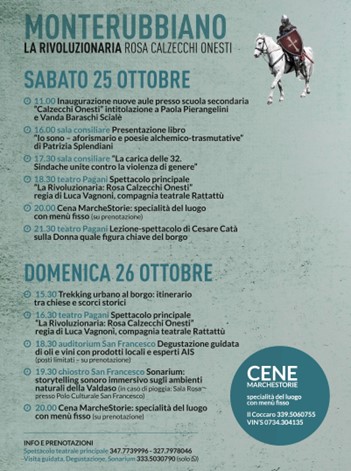 Il programma del weekend prevede in aggiunta, incontri, esperienze immersive e degustazioni che intrecciano cultura, memoria e sapori locali: Sabato 25 ottobre si terrà l’inaugurazione delle nuove aule della scuola secondaria “Calzecchi Onesti”, la presentazione del libro “Io sono – Aforismario e poesie alchemico-trasmutative” di Patrizia Splendiani, e l’incontro “La carica delle 32. Sindache unite contro la violenza di genere”. In serata, la lezione-spettacolo di Cesare Catà “Delle Donne e delle Onde. Il Femminile nell'Odissea di Omero” chiuderà la giornata al Teatro Pagani.