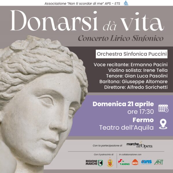 E’ un evento promosso dall’associazione "Non ti scordar di me", in collaborazione con l’associazione “Marche all’opera”, al quale parteciperanno tante associazioni di volontariato quali ANT, AVIS, AIDO, ANPAS. Nel cast figurano il tenore Gian Luca Pasolini, il baritono Giuseppe Altomare, la violinista Irene Tella e l’attore Ermanno Pacini.