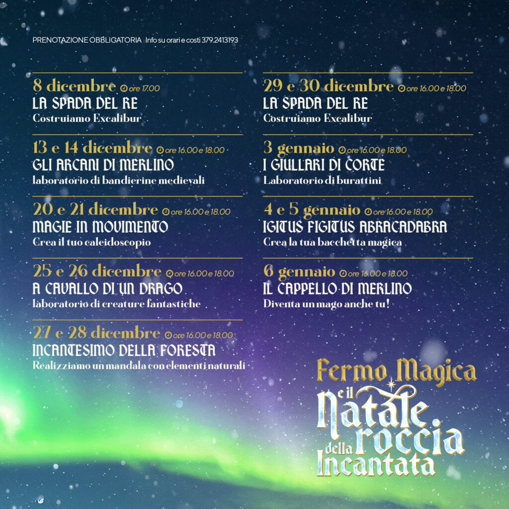 Lunedì e martedì, invece, potranno costruire la propria spada Excalibur, fatta di legno e fantasia. Il 3 gennaio spazio ai burattini, il 4 e 5 gennaio è tempo di bacchetta magica per poi chiudere il giorno della befana con il cappello del mago. Prenotazione obbligatoria per i laboratori che durano massimo 90 minuti.