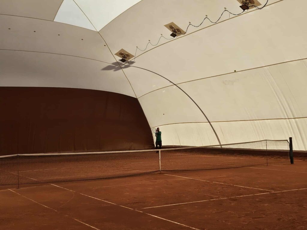 FERMO – Impossibile non notarlo, anche se il nuovo color terra che caratterizza metà pallone rende tutto più dolce. La nuova tensostruttura del circolo tennis di Fermo è realtà.