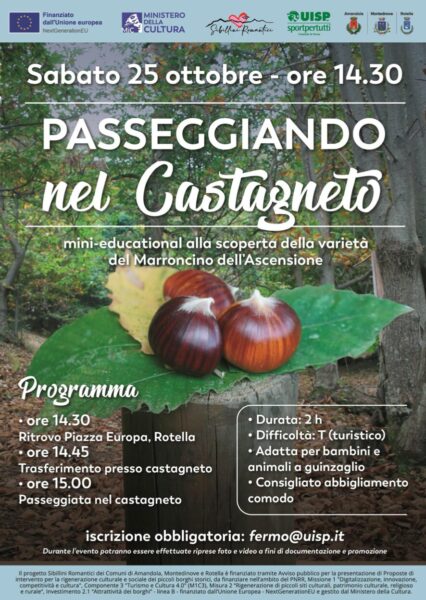 Il ritrovo è fissato in Piazza Europa a Rotella alle ore 14.30, da dove partirà una piacevole passeggiata di circa due ore, accessibile a tutti — anche a bambini e animali al guinzaglio. Si consiglia un abbigliamento comodo per affrontare in tranquillità il percorso che si snoda tra i castagneti, con vista mozzafiato sui Monti Sibillini.