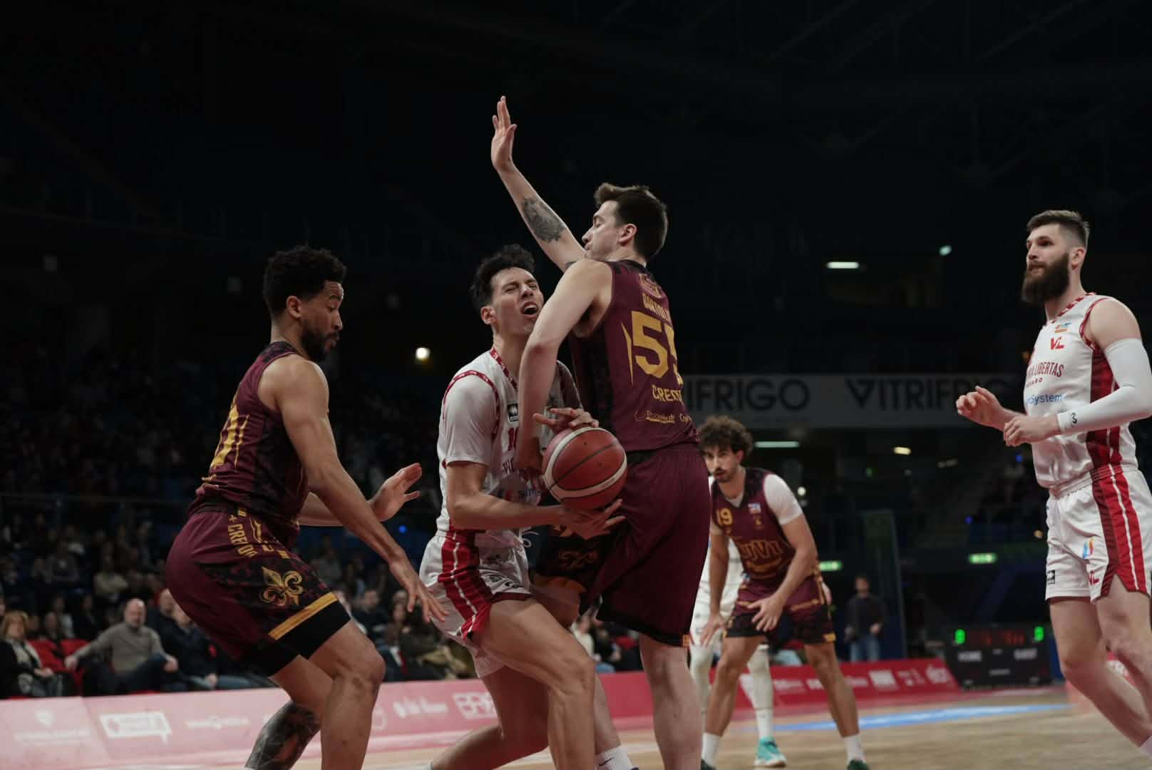 Senza Tambone e senza Allen, i due allenatori ridisegnano i quintetti e cambiano i minutaggi. Leka si attende una reazione da Bertini, impalpabile fino all’intervallo, e più coinvolgimento dei lunghi da parte dei piccoli, viste le mani gelate da fuori area.