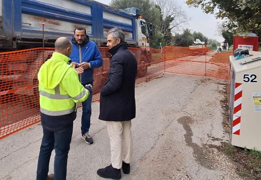 PORTO SAN GIROGIO – Un intervento che si spera possa risolvere un problema strutturale noto da troppo tempo. Il sindaco Valerio Vesprini e il vicesindaco Fabio Senzacqua hanno effettuato un sopralluogo in via Michelangelo. Sono in corso i lavori di asfaltatura e consolidamento del manto stradale, ampliamento della carreggiata, realizzazione di un nuovo marciapiede, installazione della nuova illuminazione pubblica e miglioramento del sistema di raccolta delle acque piovane.