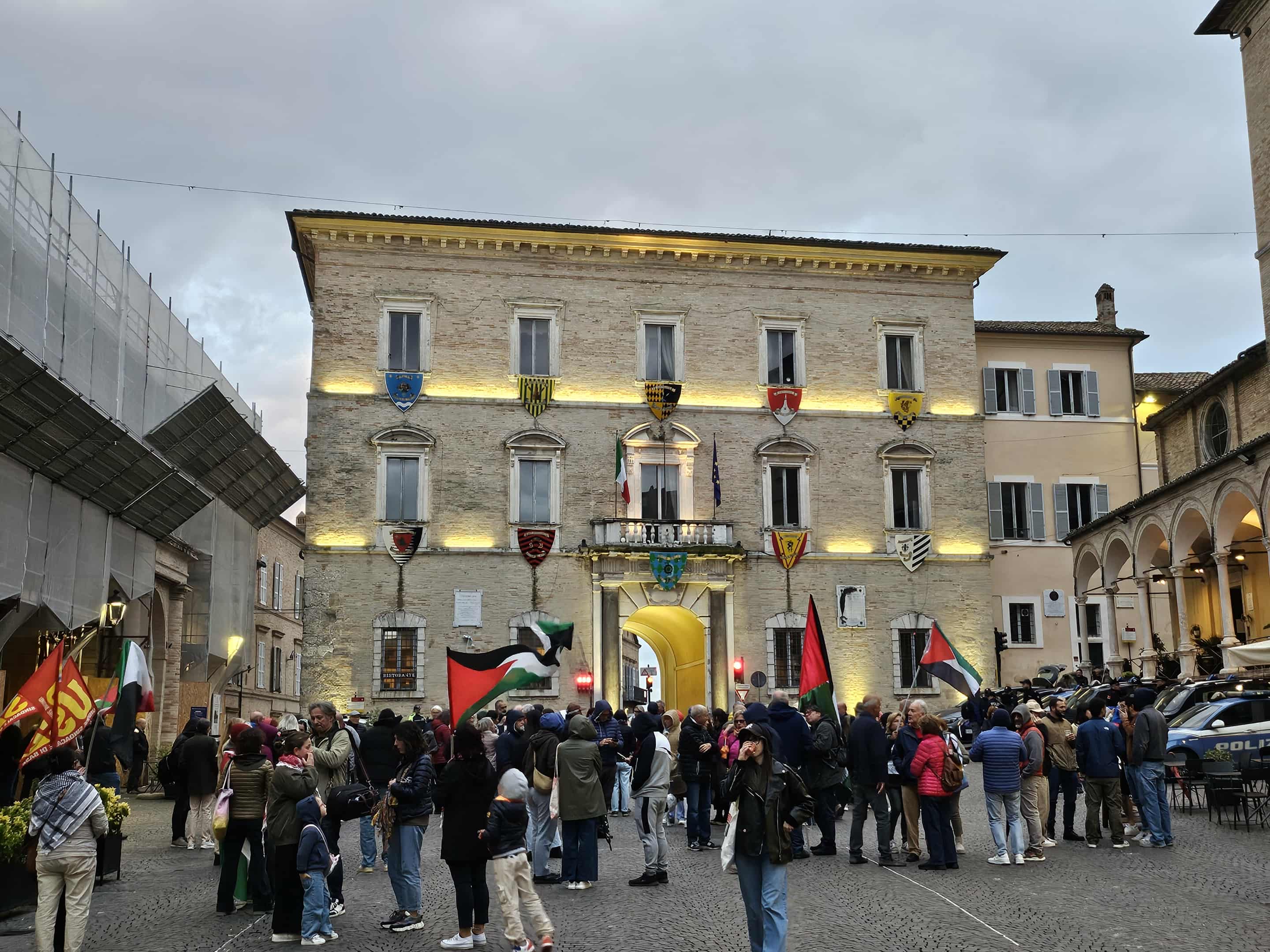 FERMO – Un centinaio di persone, sette bandiere dell’Usb e altrettante della Palestina, si sono ritrovate all’imbrunire in piazza del Popolo a Fermo, un antipasto del flash mob nazionale convocato davanti a cento ospedali, tra cui il Murri, per la serata.
