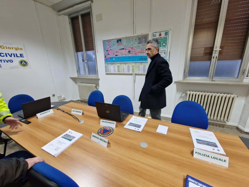 Una struttura pensata per essere operativa a pieno regime: sala riunioni, sala radio dove confluiscono le informazioni da trasmettere alle squadre sul territorio e da cui partono i report. “Dall’ufficio tecnico ai servizi sociali, chi lavora qui può continuare a svolgere il proprio compito anche durante l’emergenza” ha spiegato Pazzi.