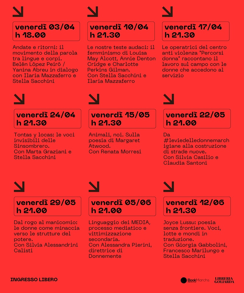Seguiranno altri otto incontri, sempre alla libreria Goliarda, e sempre di venerdì. Tra le ospiti (e qui si opta deliberatamente per il “femminile sovraesteso”) ci saranno: Renata Morresi, Marta Graziani, Silvia Alessandrini Calisti, Silvia Casilio, Claudia Santoni, Stella Sacchini, Ilaria Mazzaferro, Alessandra Pierini, Francesco Marilungo, Giorgia Gabbolini.