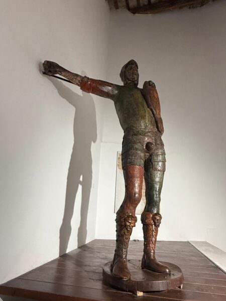 FERMO - E' tornata al suo antico splendore, dopo una serie di interventi di restauro, la statua del Margutto (FOTO), conservata ed esposta nella Pinacoteca Civica di Palazzo dei Priori. Si tratta di un manufatto in legno di rovere scolpito e dipinto, di 220 cm di altezza, raffigurante un guerriero con armatura, elmo e scudo, databile fra il XV ed il XVII secolo, rappresentante il fantoccio impiegato per il gioco della quintana o giostra dell'anello, nelle cui gare i cavalieri dovevano infilare sulle loro lance degli anelli attaccati con un laccetto proprio alla mano del fantoccio, ed oggi sostituito dalla Corsa dei Cavalli della Cavalcata dell'Assunta che si svolge a Fermo nel giorno di Ferragosto.