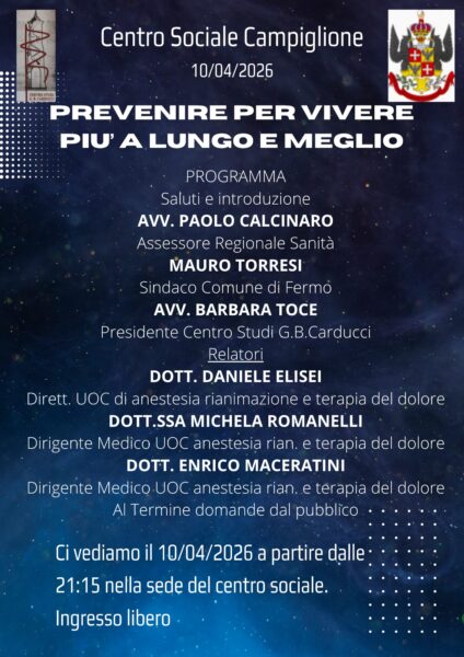 10 aprile 2026, alle ore 21.15, al Centro Sociale Campiglione sono in programma: dopo i saluti iniziali dell’assessore regionale alla sanità Paolo Calcinaro, del vice sindaco reggente di Fermo Mauro Torresi e della Presidente del Centro Studi Barbara Toce, gli interventi del dott. Daniele Elisei, direttore UOC anestesia e rianimazione e terapia del dolore dell’ospedale Murri di Fermo, della dott.ssa Michela Romanelli e del dott. Enrico Maceratini, dirigenti medici UOC anestesia rianimazione terapia del dolore, sempre del Murri. Al termine le domande del pubblico.