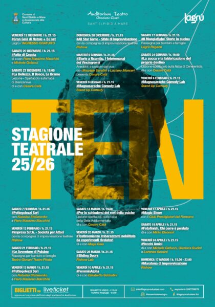 PORTO SAN GIORGIO - La stagione teatrale 25/26 dell’Auditorium “Giusti” entra nel vivo delle festività natalizie con un weekend dal doppio appuntamento, che promette di incantare e divertire il pubblico. Sotto la direzione dell'Associazione Culturale Lagrù, il palco elpidiense ospiterà due spettacoli di grande richiamo, spaziando dalla profondità della narrazione filosofica all'energia imprevedibile del teatro d'improvvisazione.