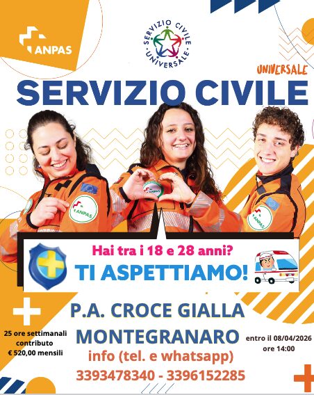 MONTEGRANARO - È aperto il bando per il Servizio Civile Universale presso la P.A. Croce Gialla Montegranaro ODV. Un'opportunità rivolta a ragazze e ragazzi tra i 18 e i 28 anni (29 anni non compiuti) che desiderano mettersi in gioco in un percorso di crescita personale e formativa nel mondo del volontariato.