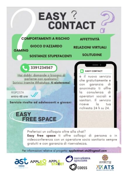 Il servizio Easy Contact si rivolge ad adolescenti e giovani adulti, in particolare agli studenti delle scuole superiori, offrendo uno spazio di ascolto e orientamento. Una psicologa risponde 24 ore su 24 a messaggi e domande su temi sensibili come comportamenti a rischio, affettività, relazioni virtuali, gaming, gioco d'azzardo, solitudine e difficoltà relazionali. I giovani potranno rivolgersi gratuitamente, e con garanzia di anonimato, alla psicologa per ricevere informazioni, consulenze e indicazioni per una valutazione delle situazioni potenzialmente critiche e che potrebbero necessitare di un intervento specialistico.