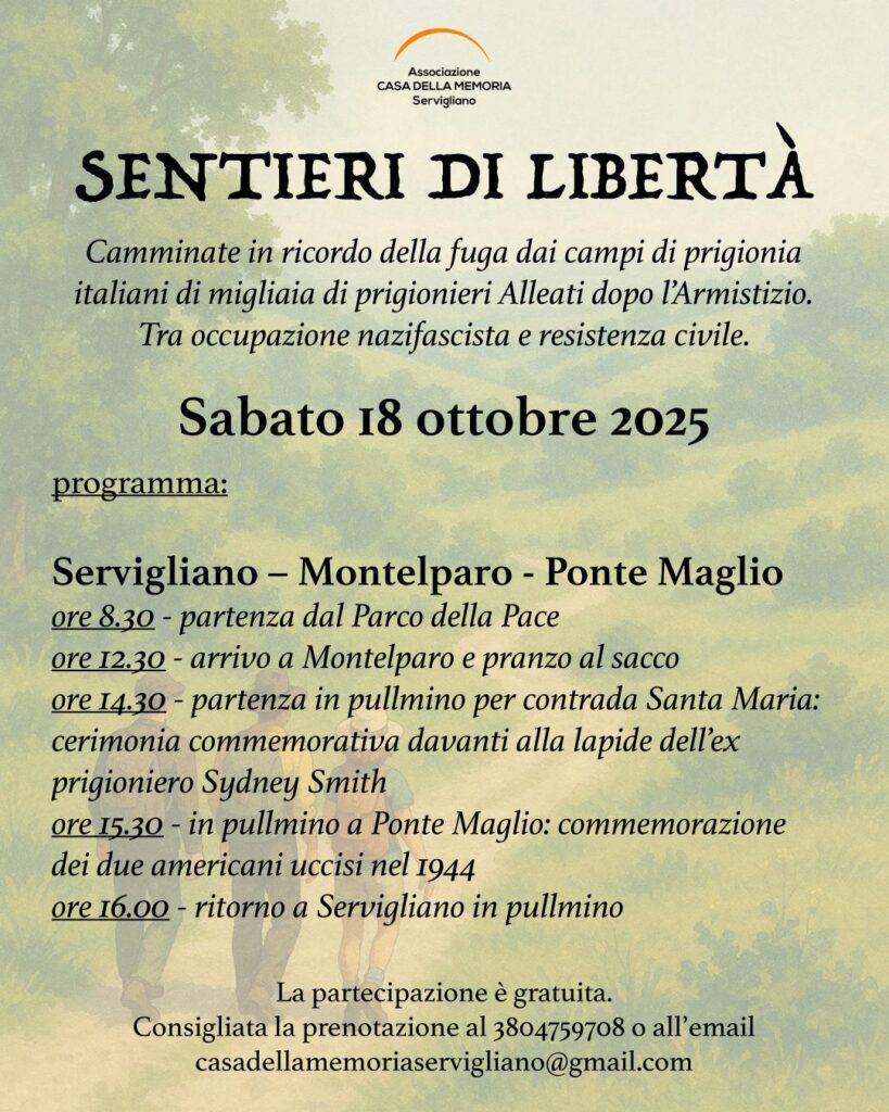 SERVIGLIANO – Appuntamento con la storia, ma soprattutto con la natura che ha accompagnato la storia. Organizzato dall’associazione Casa della Memoria, tornano i ‘Sentieri di Libertà’.