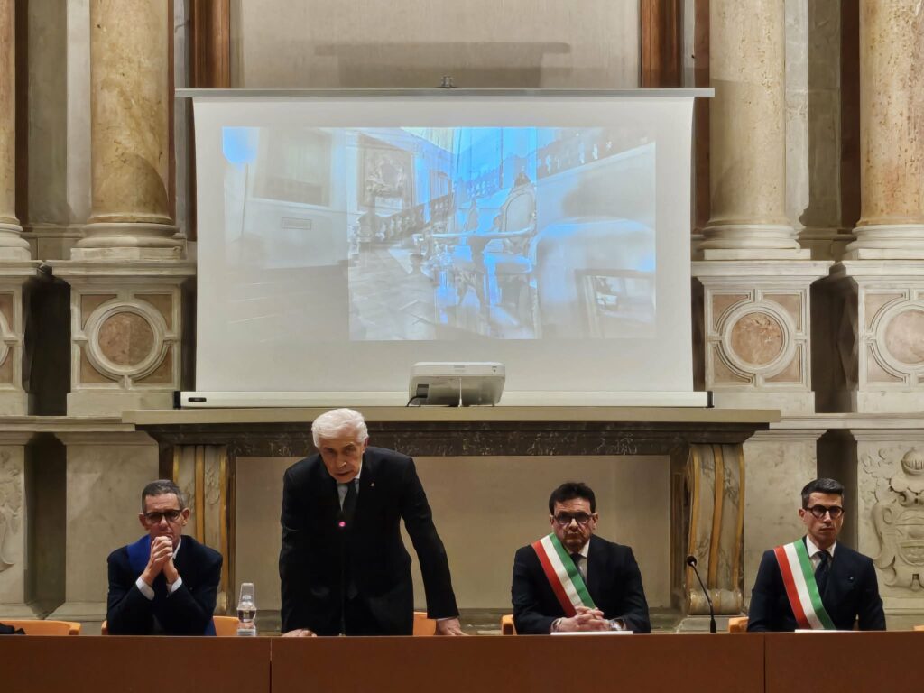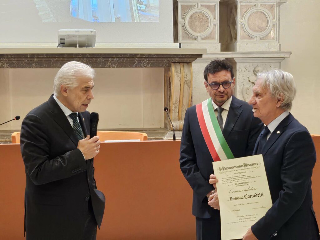 Il primo ad alzarsi è Rossano Corradetti, da oggi commendatore. Alla capo di gabinetto il compito di leggere le motivazioni. “Ha dedicato la sua vita con passione al mondo dell’arte in ogni espressione, dalla musica alla poesia fino all’impegno civile. Distinguendosi come artista, docente e promotore di iniziative sociali La sua carriera è un esempio di dedizione e costante ricerca dell’eccellenza. Grazie al suo operato, il candidato è stato destinatario di numerosi riconoscimenti che testimoniano il valore del lavoro. Ha ricevuto anche il titolo di Marchigiano dell’anno”.