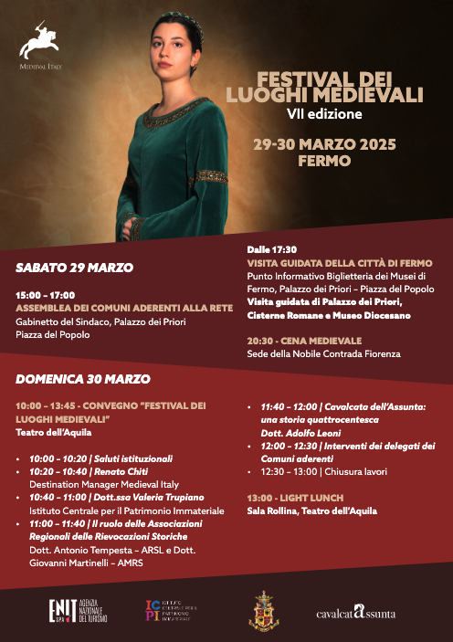 Dal febbraio scorso con il passaggio di consegne con Viterbo nel corso della Bit a Milano, Fermo è diventata città capofila della rete Medieval Italy e sabato 29 e domenica 30 marzo (parte pubblica del Festival) ospiterà, con il patrocinio del Comune di Fermo, di Enit, dell’Istituto Centrale per il patrimonio Immateriale e la collaborazione della Cavalcata dell’Assunta, la settima edizione del Festival dei luoghi medievali italiani, diventando per due giorni la capitale italiana delle città medievali.