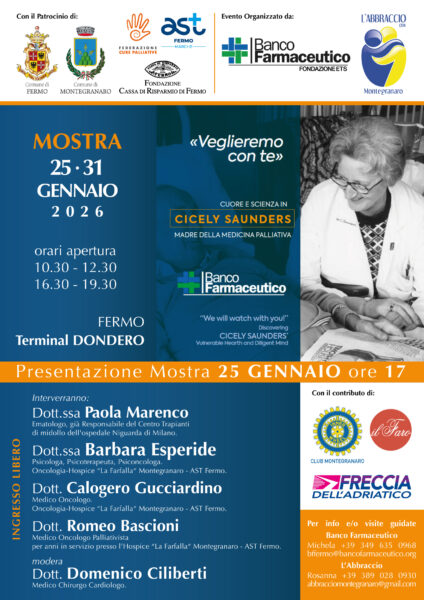 La mostra, al Terminal Dondero, è organizzata da Banco Farmaceutico – Delegazione di Fermo e Associazione L’Abbraccio ODV di Montegranaro, realtà unite dalla condivisione di una comune cultura del dono: da un lato il recupero e la distribuzione di farmaci a persone in condizioni di povertà sanitaria, dall’altro la presenza quotidiana accanto ai malati e alle famiglie all’interno dell’Hospice “La Farfalla” di Montegranaro, insieme a un costante impegno nella diffusione della corretta informazione sulle cure palliative.